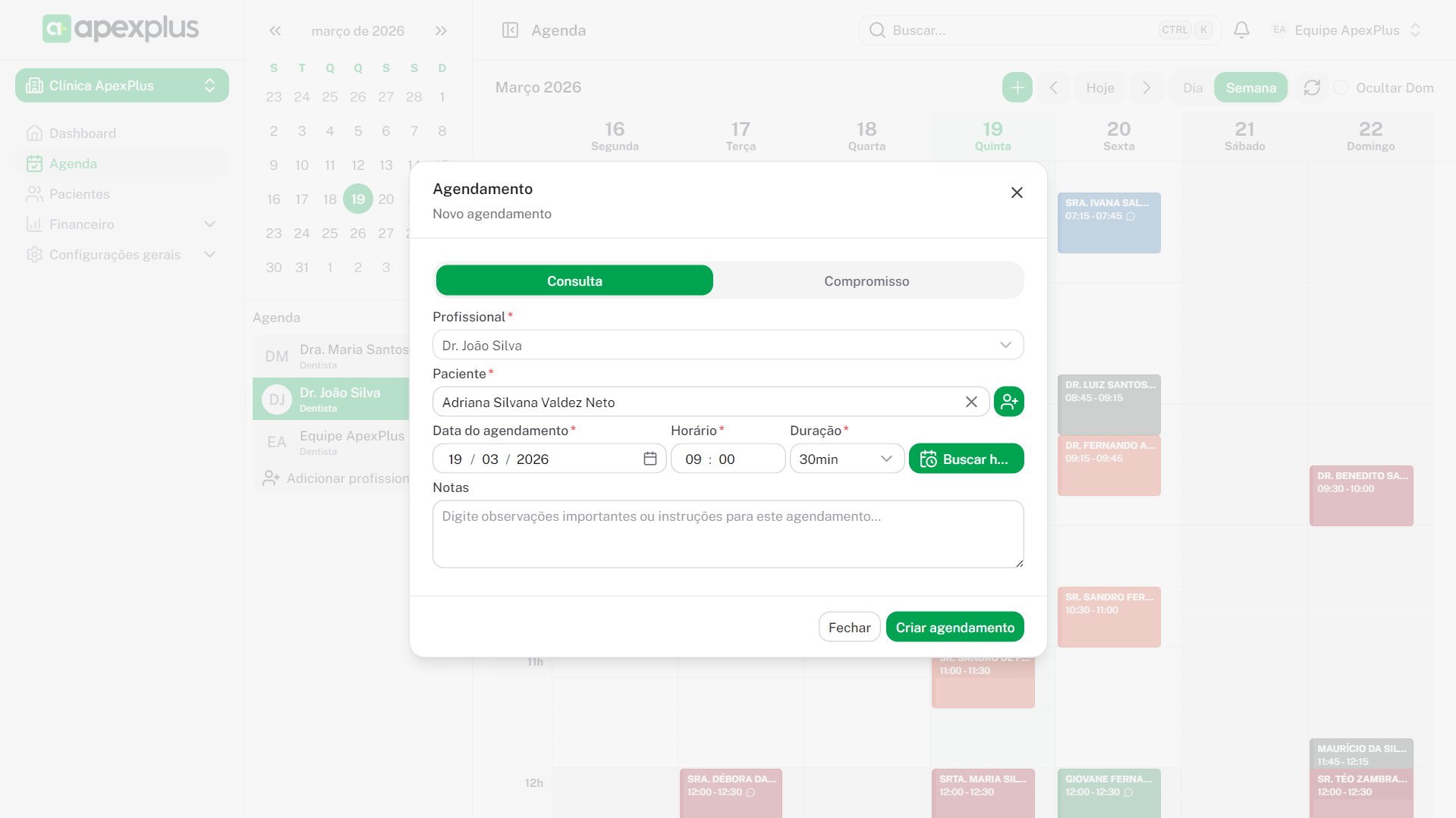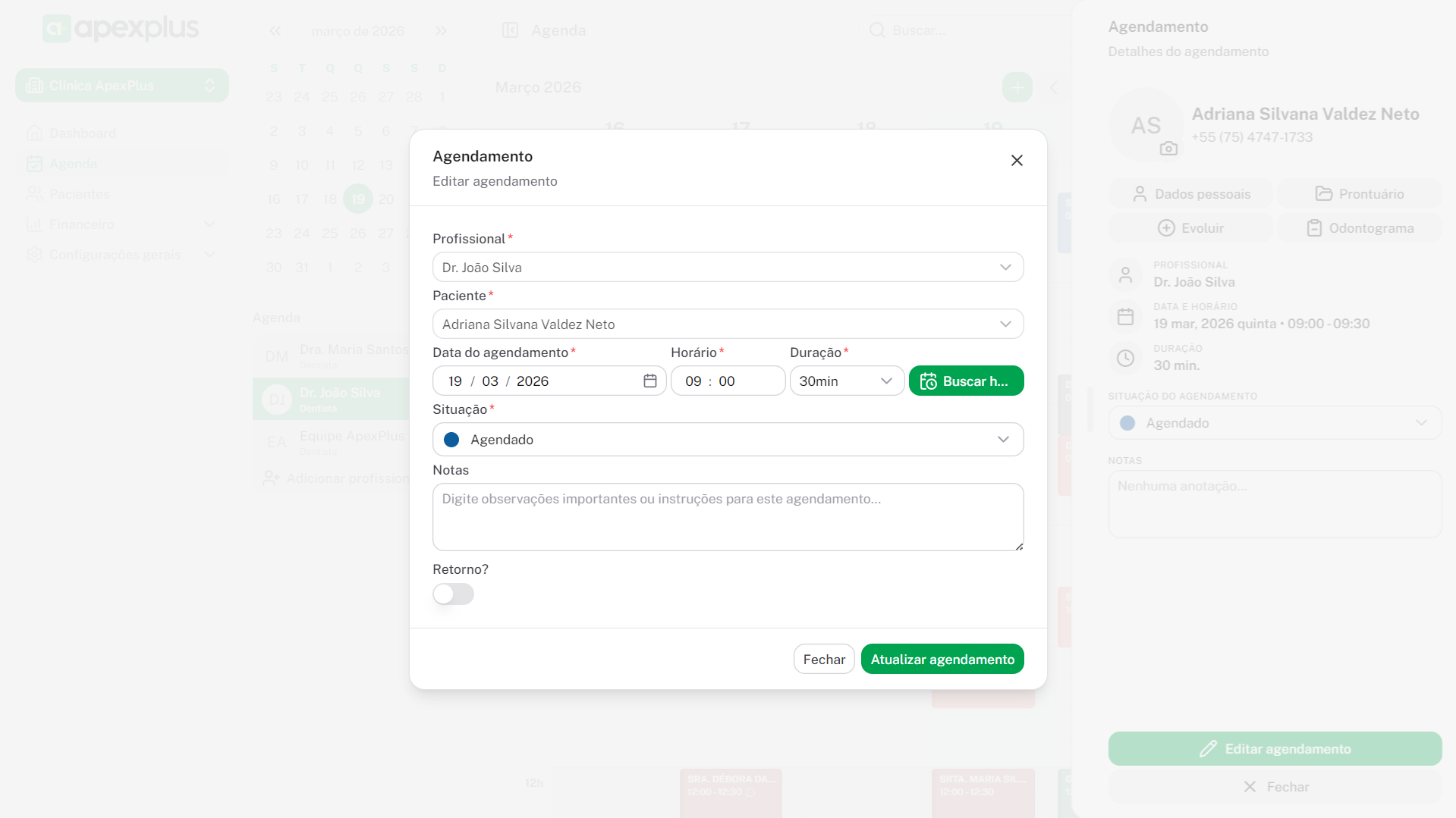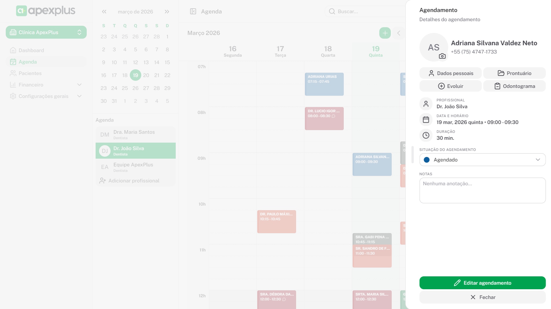 Clique em um agendamento na agenda para ver detalhes: dados pessoais, prontuário, evolução, odontograma, profissional, data/hora, duração e situação.