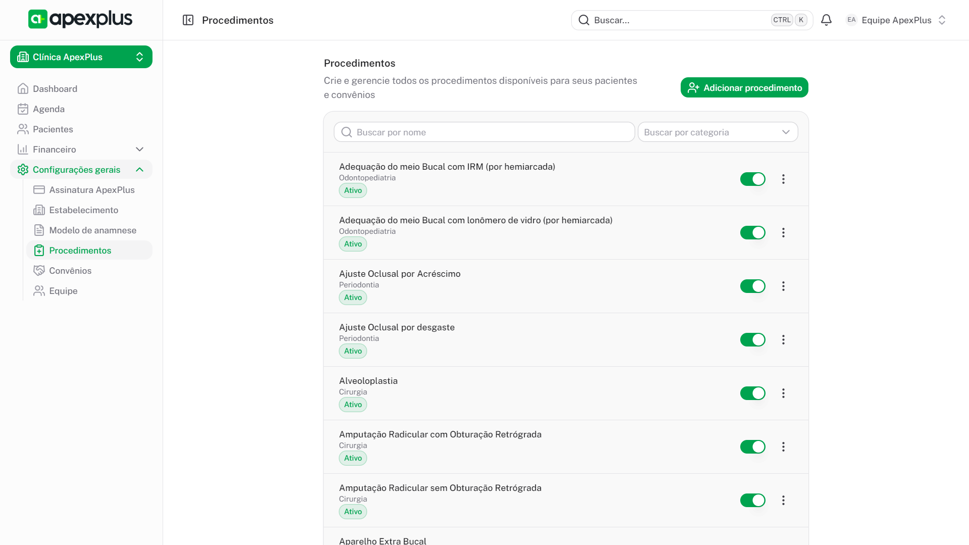 Veja a lista de procedimentos cadastrados, com nome, categoria e status.